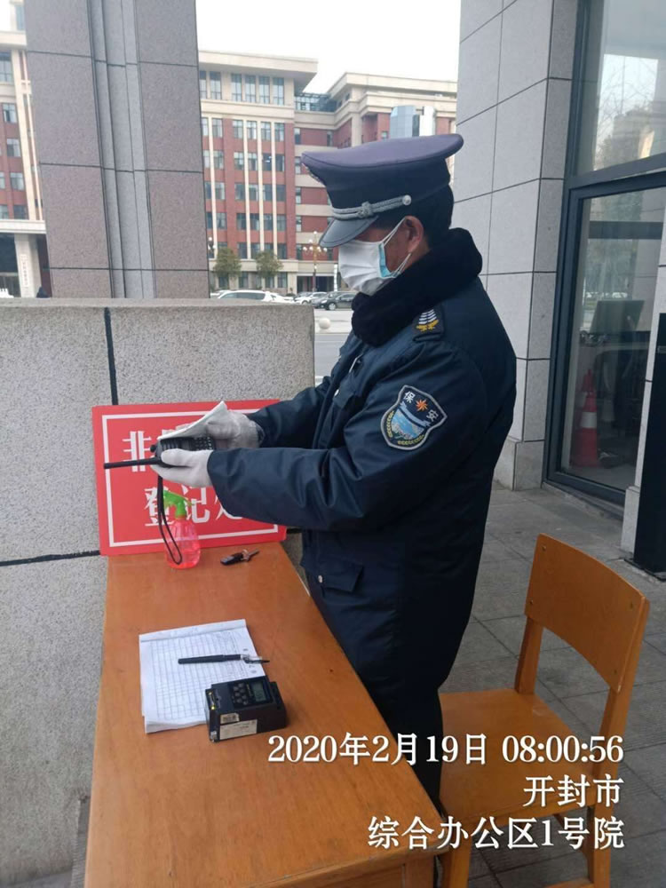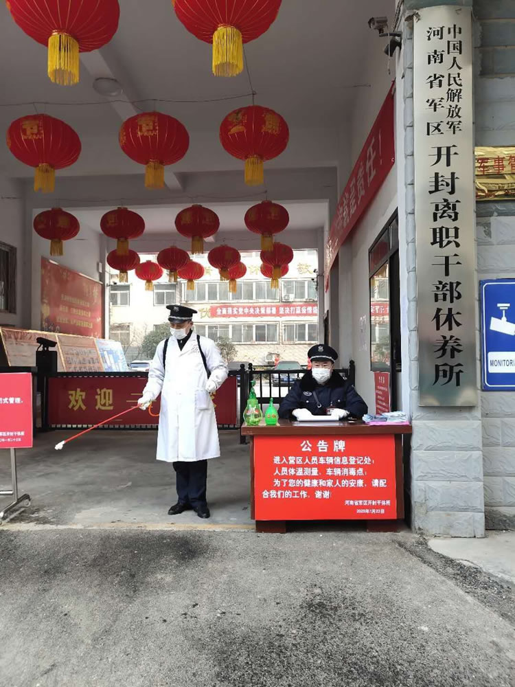 5、河南省軍區開(kāi)封離職干部休養所崗點(diǎn)的保安員盡職盡責。接到防疫任務(wù)后,保安員實(shí)行全封閉管理,隊員24小時(shí)堅守崗位,嚴格控制進(jìn)出人員,承擔著(zhù)出入人員體溫測量、車(chē)輛消毒、軍干所場(chǎng)所的消毒任務(wù),并做好登記工作。
